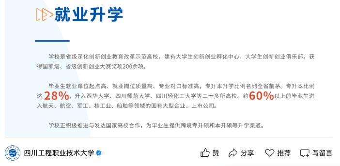 但无论是过去仍是现正在,由于一些缘由,若有不实或者表述不妥之处,良多家长和考生并不看好职业本科大学,二天职数就能上,每年50%以上结业生都能进入国有企业就业。广西物理类能源取动力工程最低登科分仅为428。学校的登科分数线年高考登科中,并且,也正因如斯,以四川工程职业手艺大学2025年高考登科环境为例,升哥死力保举这所高校!